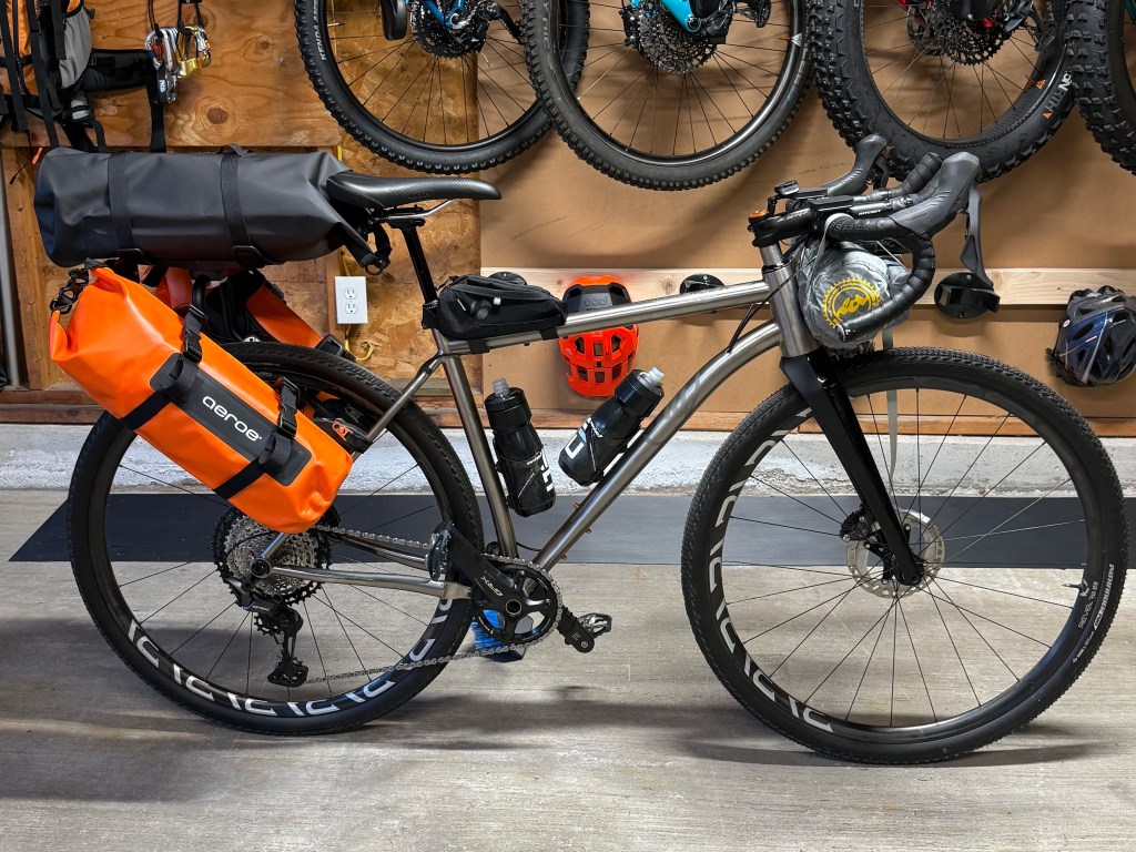 I’m relying on the innovative Aeroe bikepacking system, whose lightweight and versatile bags are perfect for carrying my gear. Safety orange is a must-have for visibility on the road. Speaking of gear, I’ve got my adjustable out-front bike computer mount and quad lock for my phone accessible, Garmin bike radar, mini aero for shoulder relief on long stretches, and a Big Agnes HV UL2 bikepacking tent.