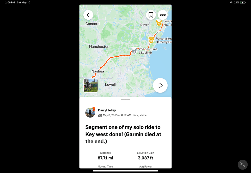• Segment 1 done! Maine to Leominster, MA I just finished the first day of my solo ride to Key West!
