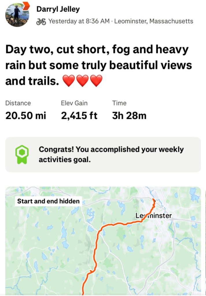 Heavy fog and poor weather conditions made the journey a bit challenging. I had to make a stop in the town of Rutland, Massachusetts. Interestingly, the hill climbs felt similar to those in Rutland, Vermont. The fog was incredibly dense, and the rain was heavy and cold.